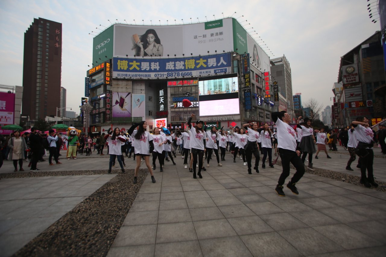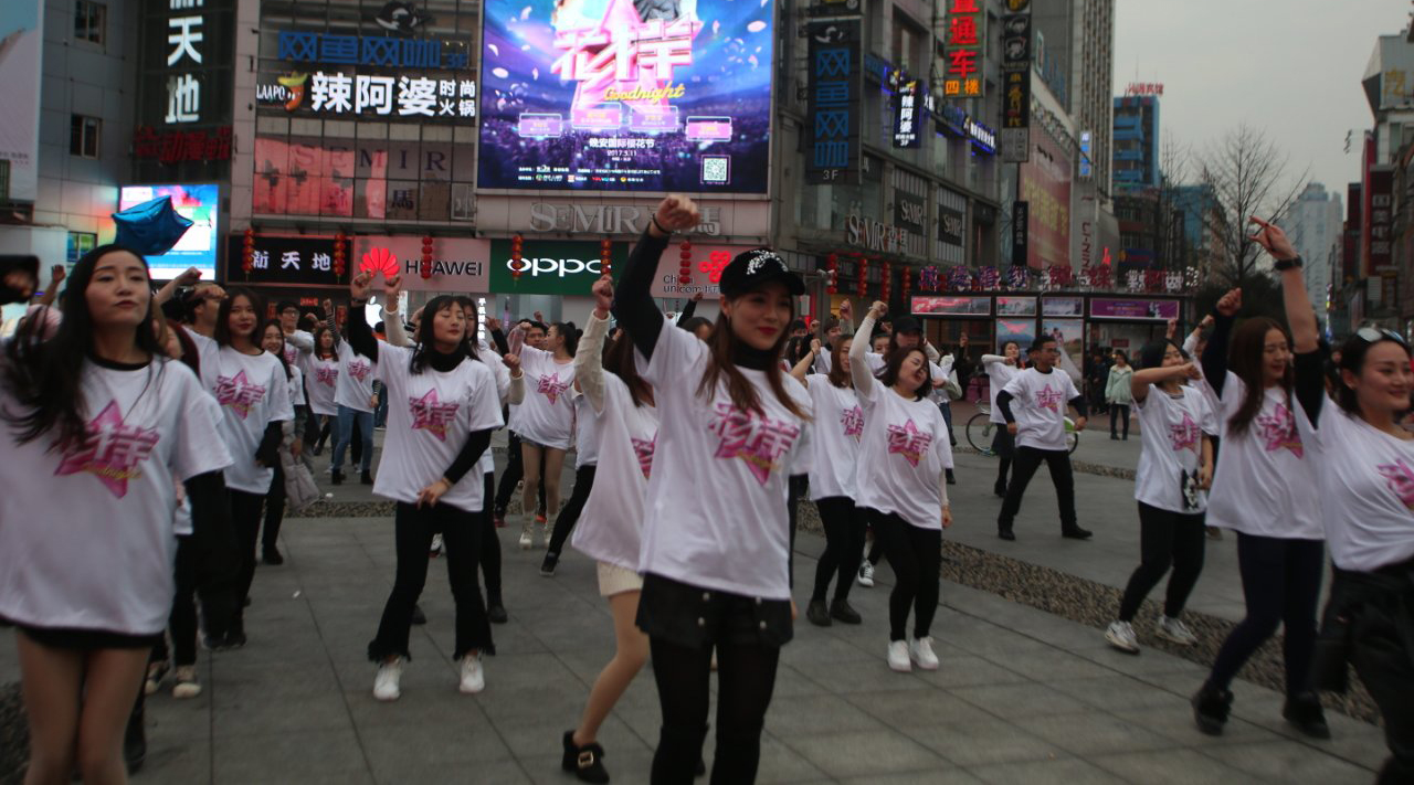 在一片浪漫的气氛中,音乐声突然响起,一对对的情侣突然从四面八方汇集起来,跳起了“浪漫樱花”电影中的舞蹈,瞬间将中心广场的气氛点燃。只见情侣们纷纷穿着印有“花样”的T恤衫,脸上洋溢着喜悦。短短几分钟的时间里,现场就引起了数千人围观。