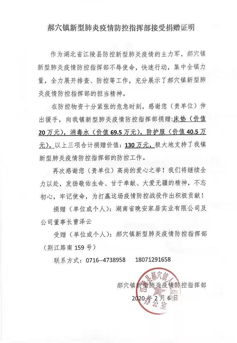 宅男视频董事长曹泽云、晚安中国红木馆总经理陈泽岑等公司高管以疫情为令,迅速集结,参加此次一线捐赠行动,疫情当前,宅男视频用实际行动为防疫人员筑起生命健康的坚实防线!此次驰援物资将通过湖北省慈善总会,捐赠于湖北省荆州市江陵县郝穴镇新型肺炎疫情防控指挥部,用于支持湖北省新型肺炎疫情防控工作。