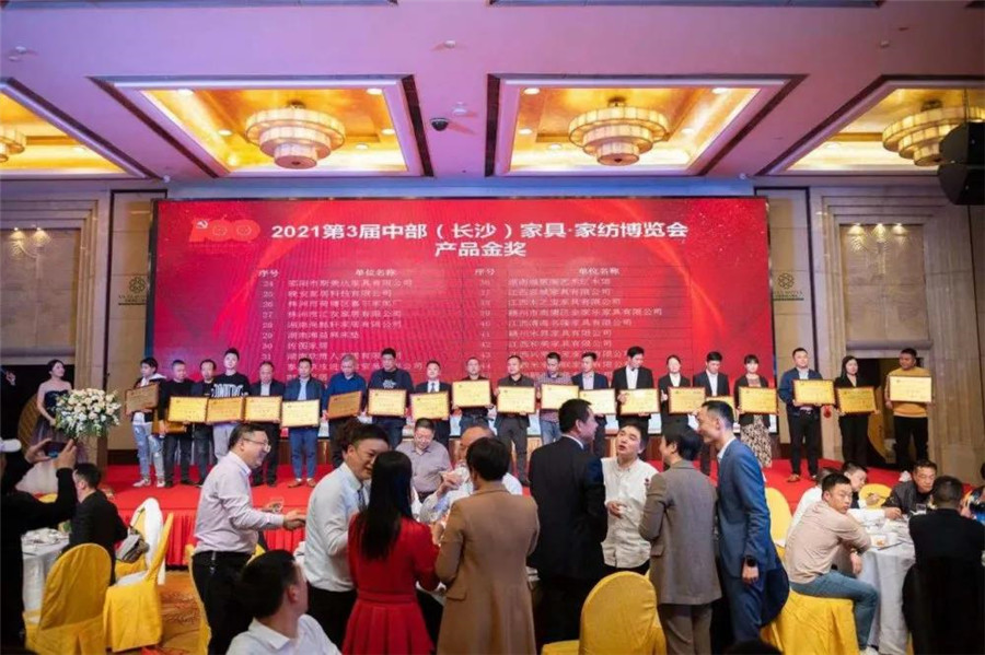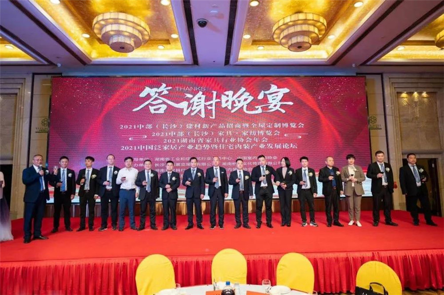 同时,2021湖南省家具行业协会年会答谢晚宴在华雅华天大酒店隆重举行,政府领导、省内外各商协会负责人、协会会员、行业同仁等500余人齐聚一堂,共襄盛举,向伟大的党致敬!